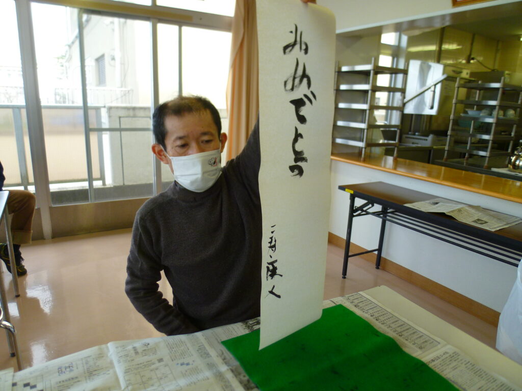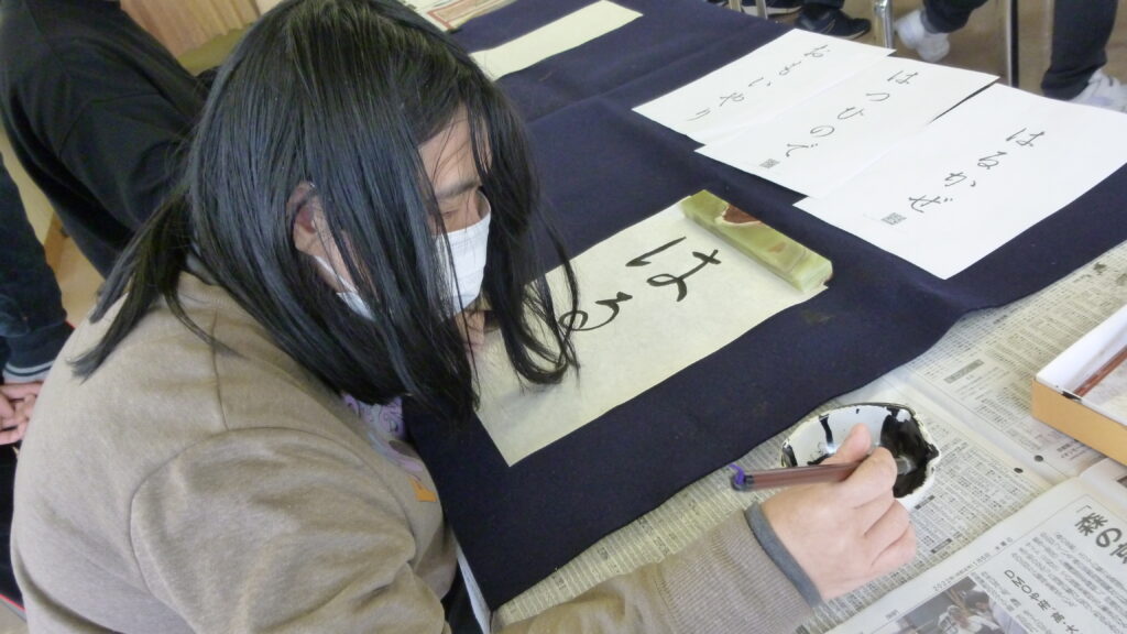 書初めは、お手本を見ながらじっくりと取り組まれたり、今年の目標を考えて書かれる方もいました。みなさん真剣に取り組まれていました。