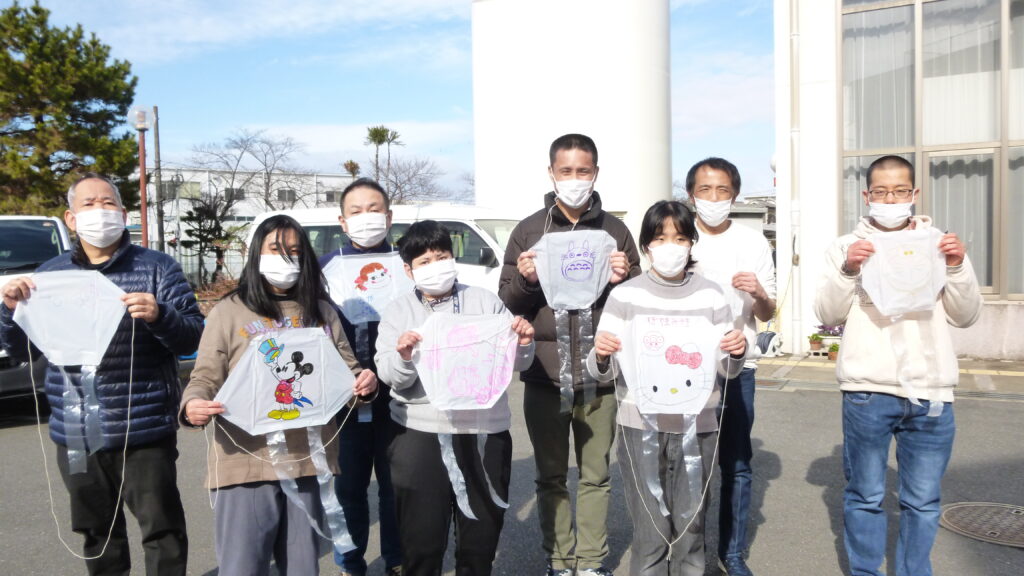 凧にそれぞれ好きな絵を書いて組み立てました。お天気が良かったので、屋外で飛ばしました。なつかしい遊びを楽しみました。