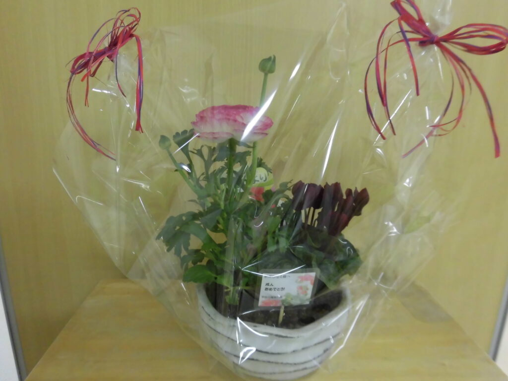 また、なずな班で寄せ植え・ラッピングをさせていただいたお祝いの花を贈呈しました。