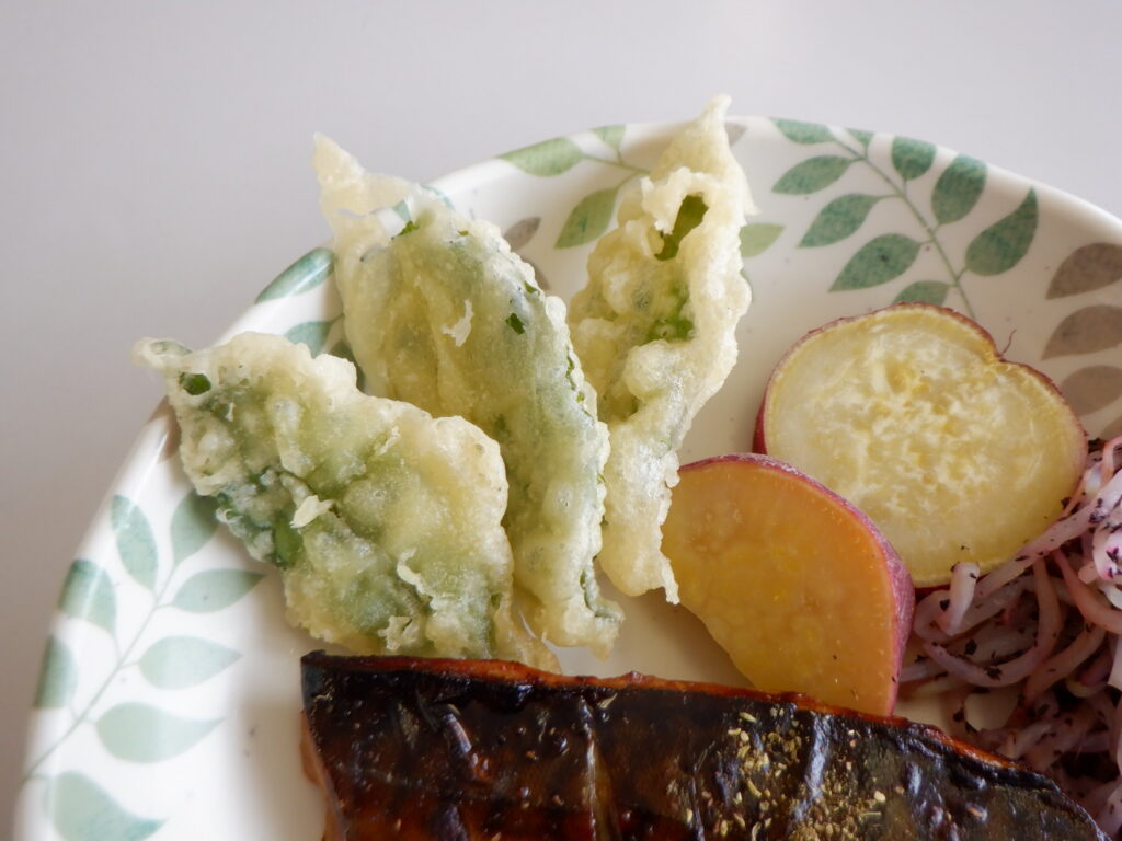 昼食には摘んだばかりのお茶の葉を使った天ぷらが提供されました。