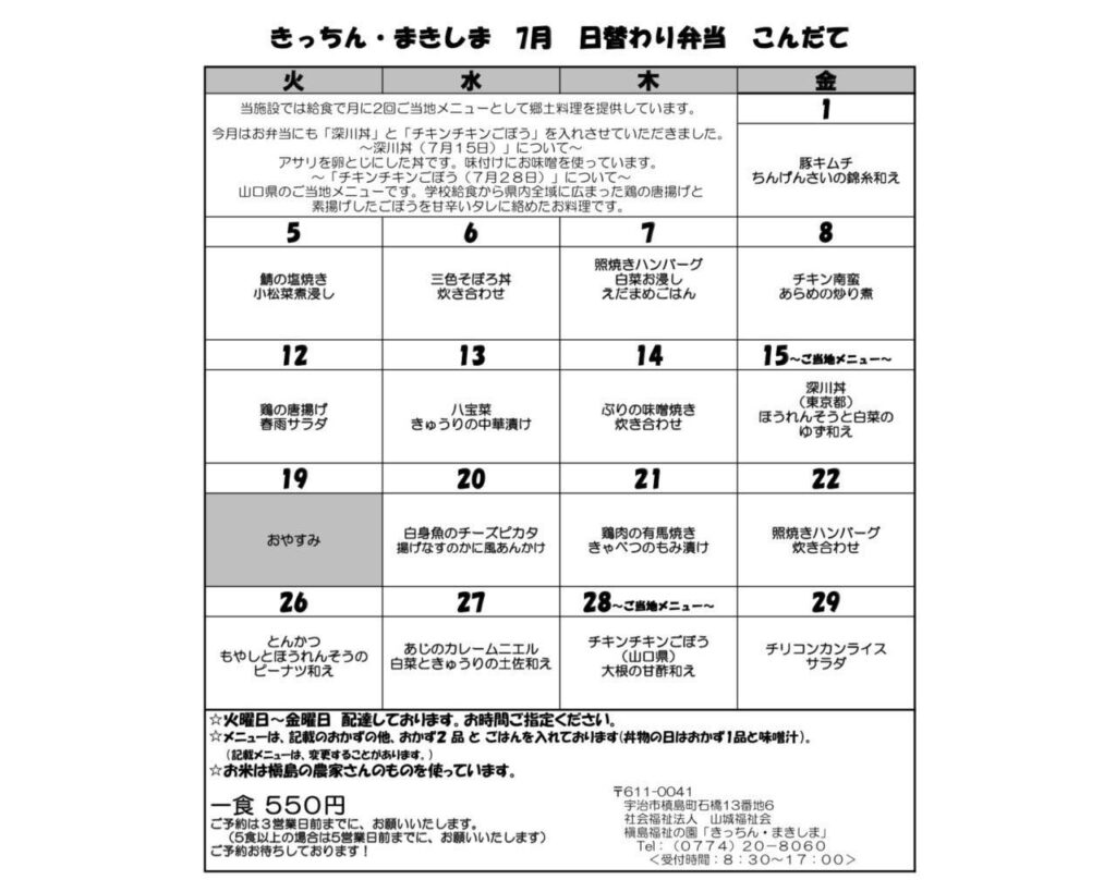 JUN 28 2022 槇島福祉の園 「きっちん・まきしま」 今日のお弁当は「いりこごはん」と「小松菜のけんちゃん」です。 こちらは香川県のご当地メニューです。 けんちゃんは、細切り野菜の油炒めに豆腐を入れて炒めたしっぽく料理の【けんちん】がなまったといわれています。 また、穏やかな瀬戸内海で生産されるいりこは濃厚で旨味の強い出汁がとれることから、名物の讃岐うどんをはじめさまざまな家庭料理にいりこ出汁が使われています。 7月も、ご当地メニューが登場します。 是非ご賞味くださいね。 投稿者: admin槇島福祉の園 宇治川アート作品 ふれあい花壇