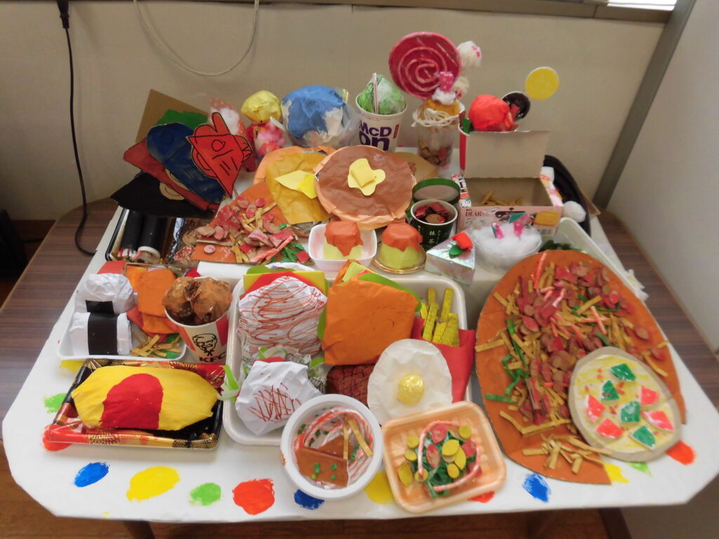 ・廃材や段ボール等を使用して作った作品です。好きな食べ物を形にしてみました!台座の上に沢山食べ物がのって豪華ですね^^