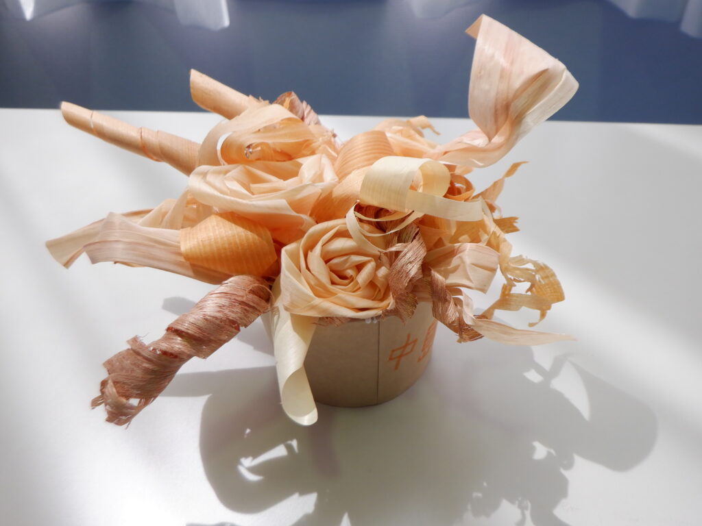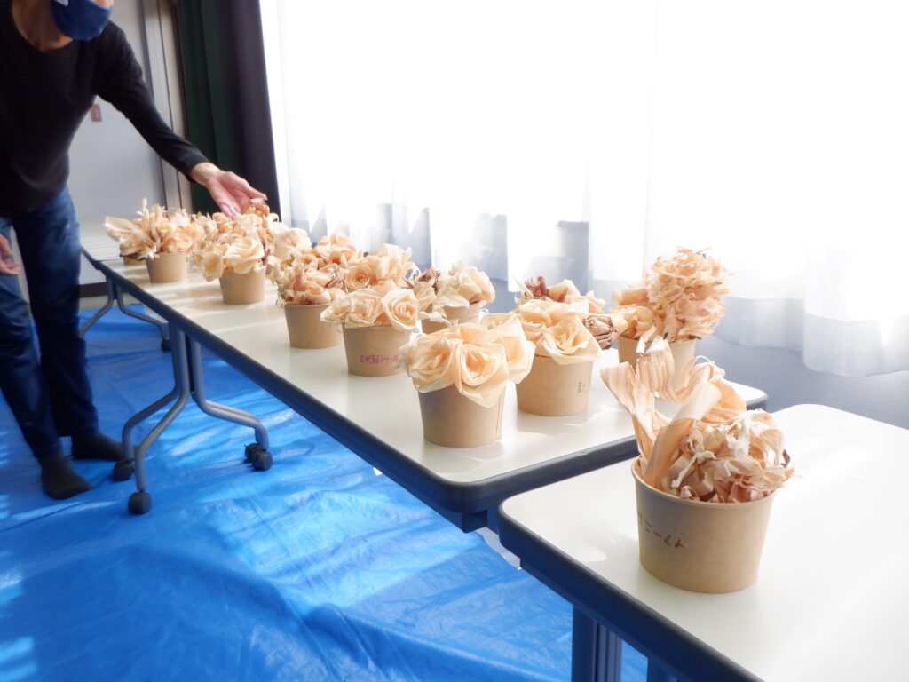 かわな工業様からのお二人の講師を迎え、土曜日課の半日、カンナ屑を利用した花の作り方を教えていただきました。元の木の種類によって微妙に色合いが異なり、みなさんはそれをうまく生かしながら制作されています。