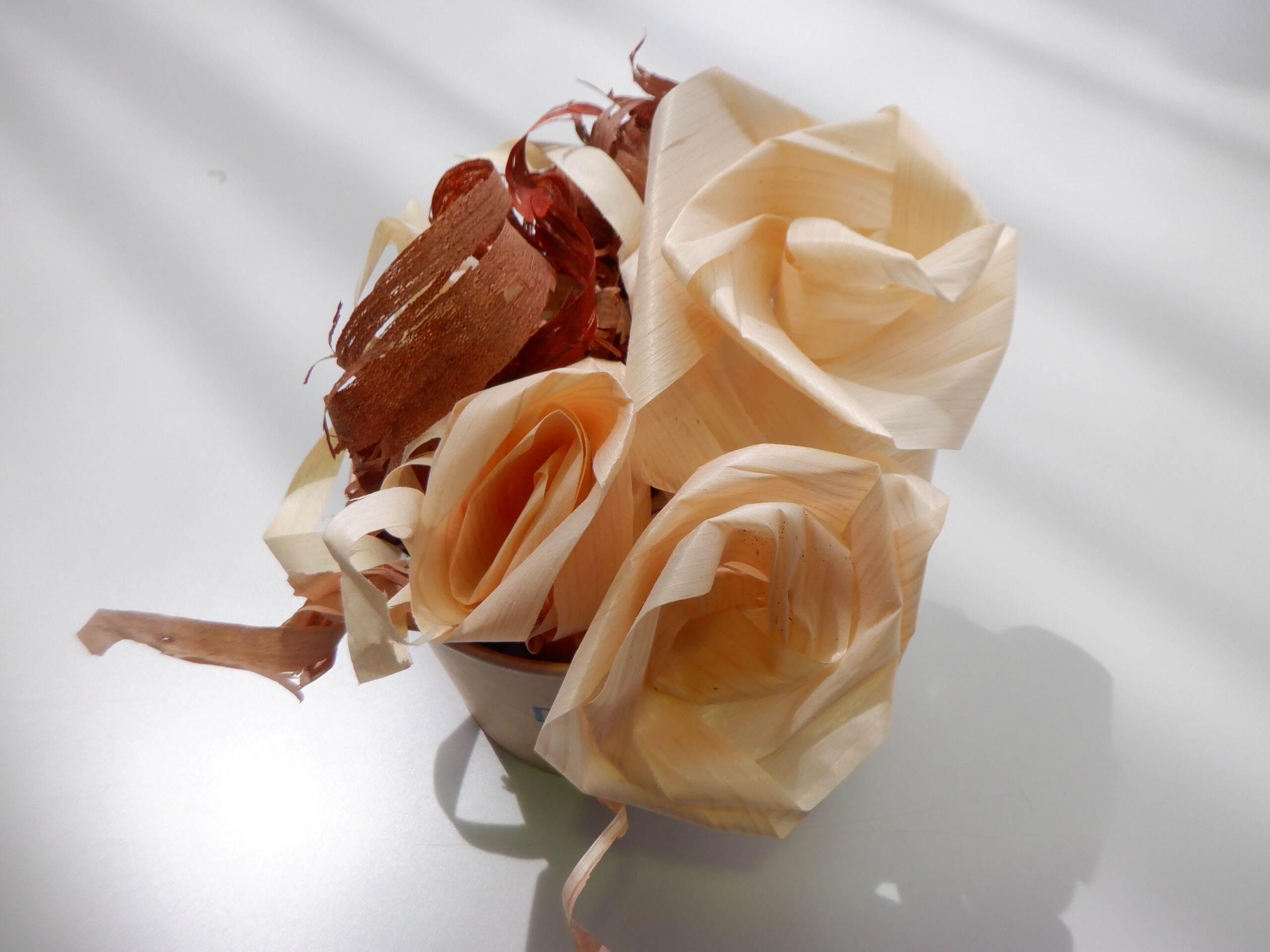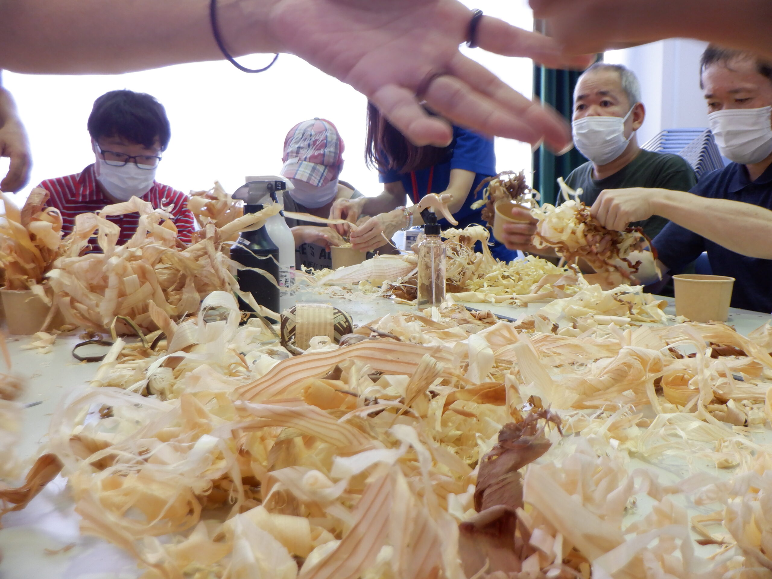 かわな工業様からのお二人の講師を迎え、土曜日課の半日、カンナ屑を利用した花の作り方を教えていただきました。元の木の種類によって微妙に色合いが異なり、みなさんはそれをうまく生かしながら制作されています。