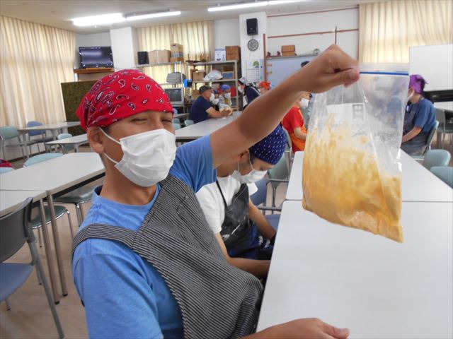 エプロン・三角巾に身を包み、材料を混ぜ混ぜ