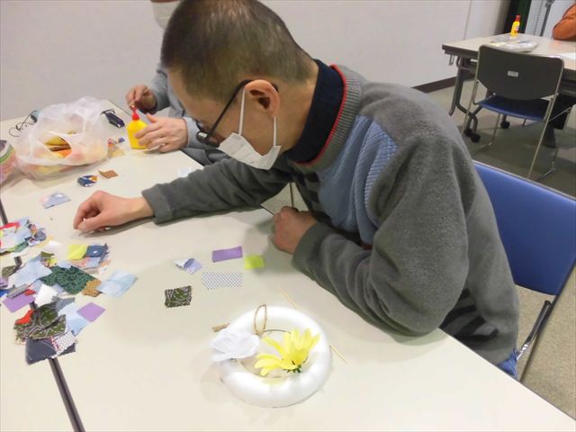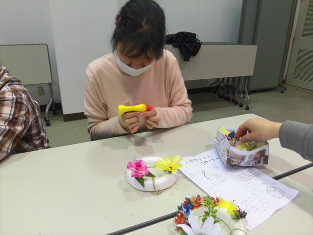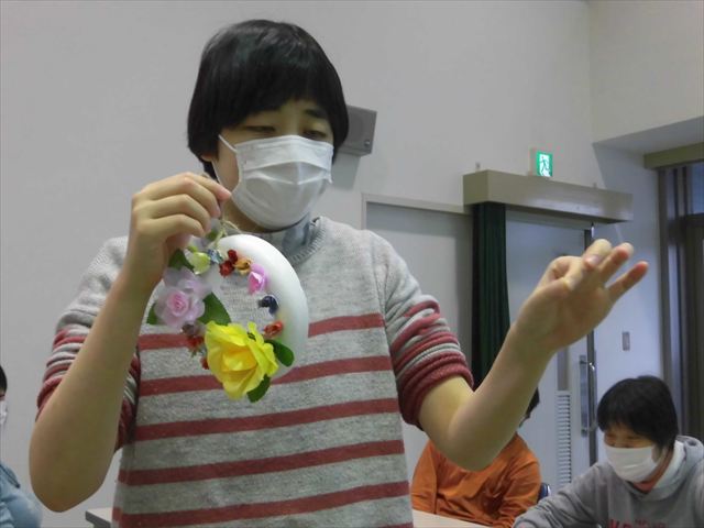 発泡スチロールに布や造花を飾りつけて、素敵な作品ができました。完成後は仲間に向けて、自分の作品を発表し、個性が光る作品の数々に皆さんも見入っていました。