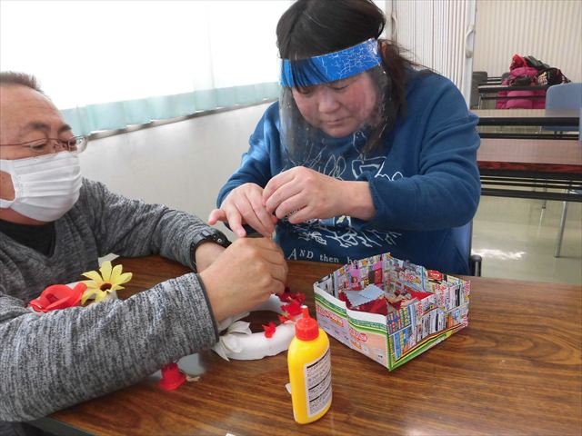 発泡スチロールに布や造花を飾りつけて、素敵な作品ができました。完成後は仲間に向けて、自分の作品を発表し、個性が光る作品の数々に皆さんも見入っていました。