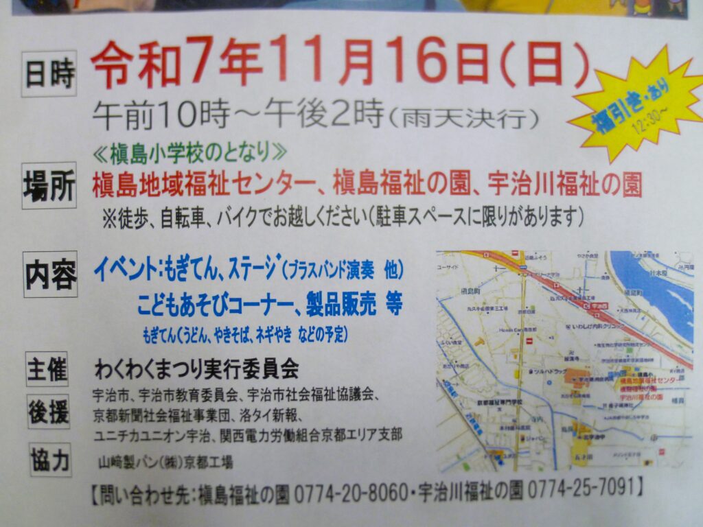 山城福祉会 宇治川福祉の園・槇島福祉の園で開催される【わくわく祭り】が約1か月後の11月16日(日)に開催されます! 内容も盛りだくさん(^^♪ 楽しいステージや、たくさんの模擬店、製品・野菜販売、子供たちも楽しめる遊びコーナー、何が当たるかお楽しみ♪福引もあります。 ご都合がよろしければ、ぜひお越しください!!